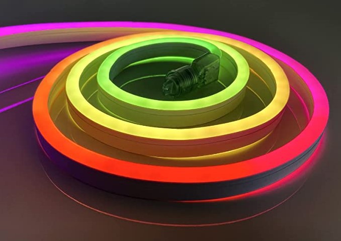 Leuchtende, ständig wechselnde Farben, hohe Helligkeit, kontinuierliches Licht, keine dunklen Flecken: Die flexiblen Silikonschläuche können in verschiedene Formen gebogen werden, um einzigartige Stücke zu schaffen. Der Neon Flex Regenbogen kann nicht nur statische Farben anzeigen, sondern auch mehrere Farben gleichzeitig. Außerdem bietet das Produkt drei Lauflichtfunktionen, zwei Lichteffekte und den Regenbogenmodus. So erzeugt es im Unterschied zur normalen Neon Flex viele unterschiedliche Wirkungen.